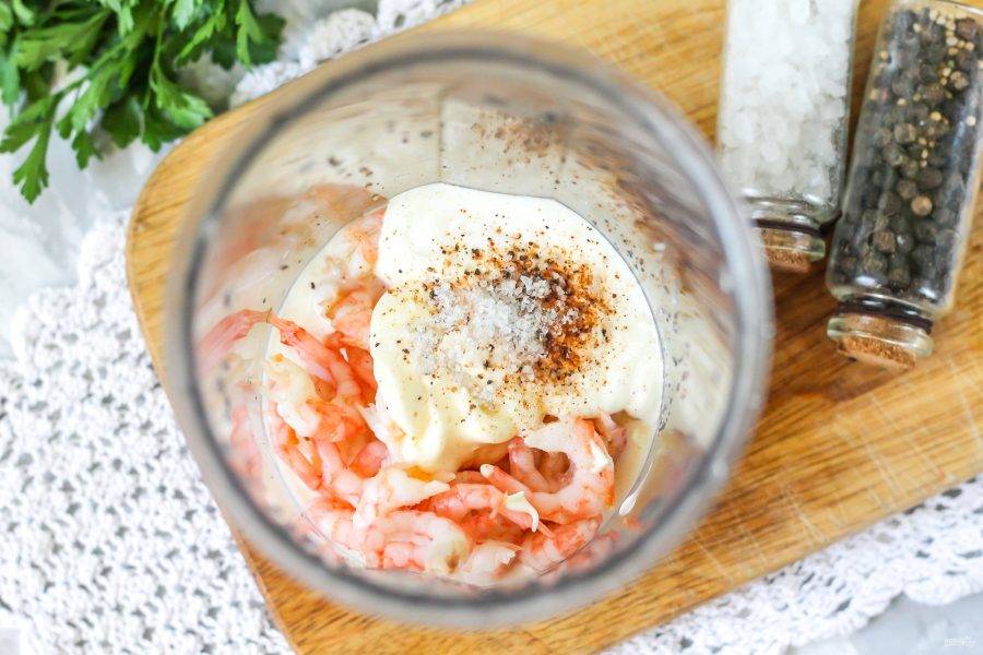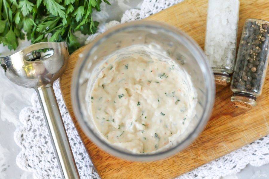 Пересыпьте их в глубокую миску или емкость для блендера. Выложите туда же сметану и майонез любой жирности, но с нейтральным вкусом, не чесночным! Посолите и поперчите.