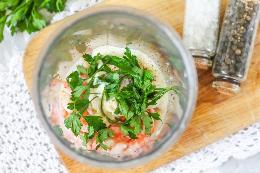 Промойте листья петрушки и добавьте в емкость. Много зелени не добавляйте, чтобы она не перебила креветочный вкус и аромат.