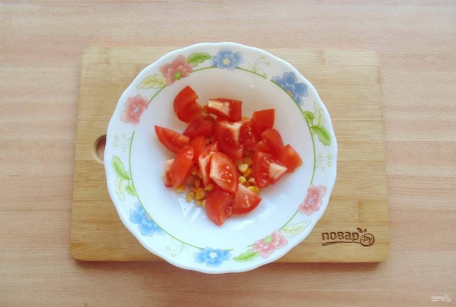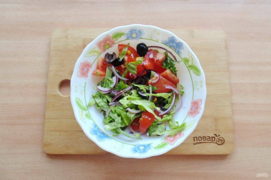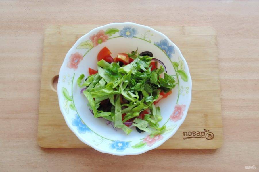 Нарежьте лист салата и петрушку. Добавьте в салатник.