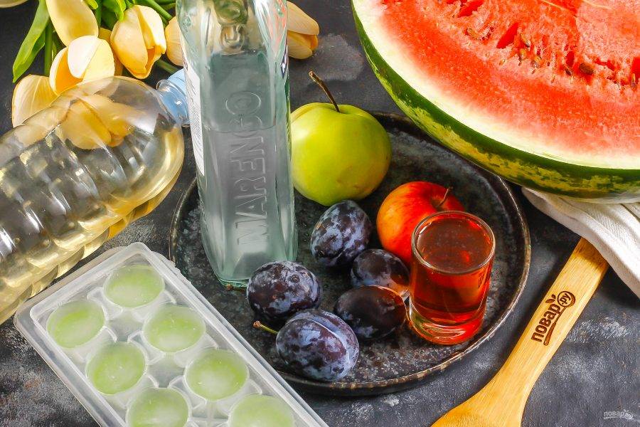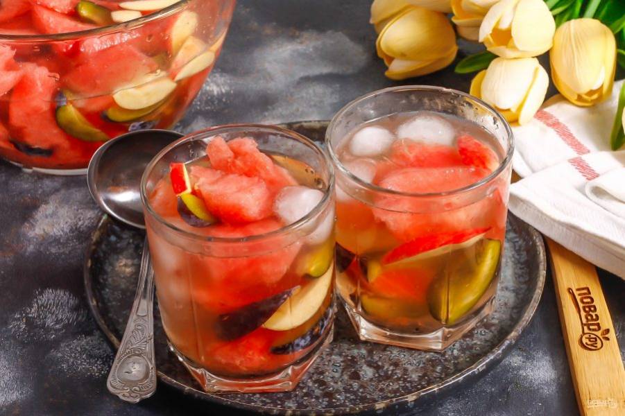 Ароматный алкогольный напиток в летнее время можно приготовить из арбуза и других фруктов с добавлением шампанского, коньяка и т.д. Фрукты и ягоды выбирайте по своему вкусу и не забудьте про лед!