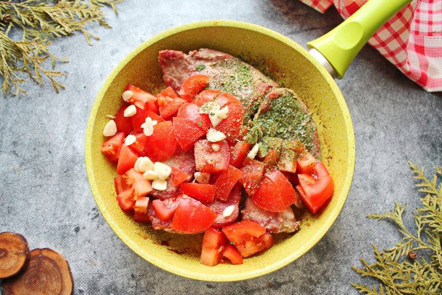 Помидоры порежьте на кусочки и добавьте к кролику. Порежьте остальной чеснок, вместе со специями добавьте в сковороду.