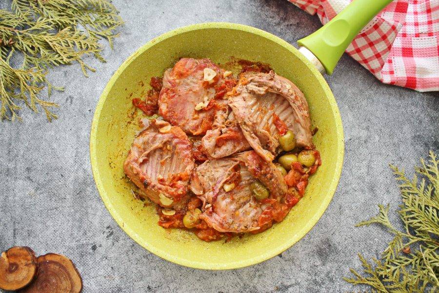 Влейте в сковороду бульон, посолите и добавьте оливки.