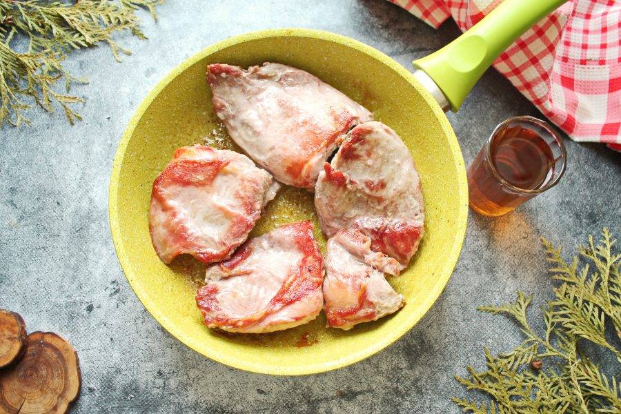 Выложите куски кролика и обжарьте на сильном огне до румяной корочки с двух сторон.