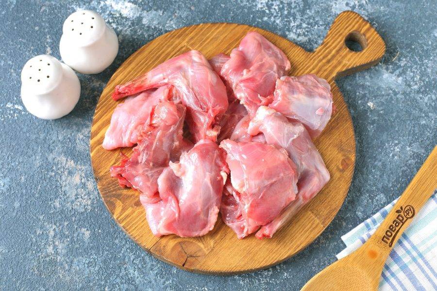 Кролика разделайте на порционные кусочки, промойте и обсушите.