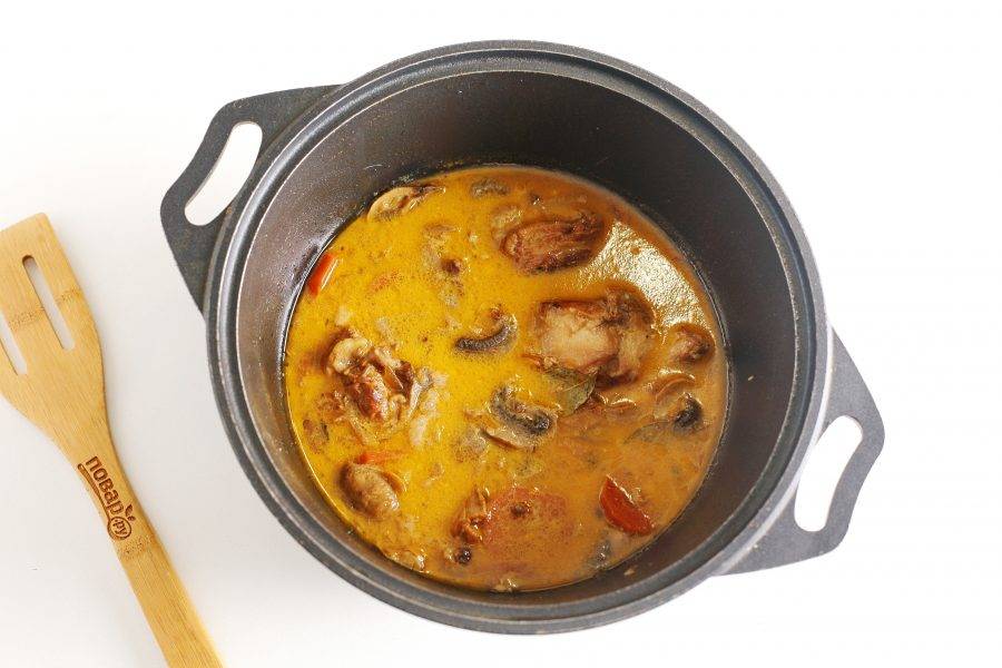 Затем добавьте нарезанные шампиньоны и чеснок. Оставьте кролика с грибами и овощами в казане еще на 20 минут потомиться.