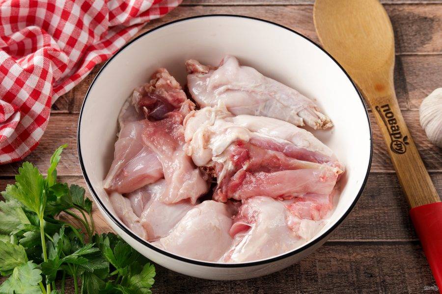 Кролика промойте, обсушите и порубите на части. По желанию мясо можно предварительно слегка отбить.