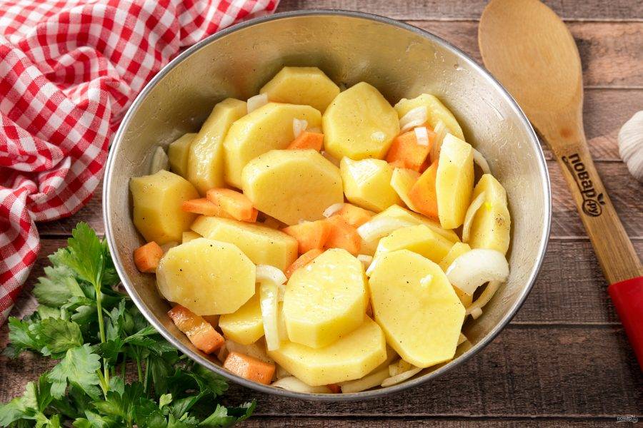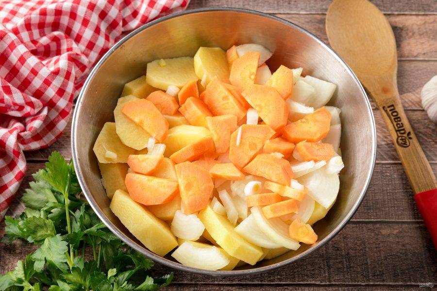 Овощи нарежьте произвольно, но не слишком мелко, иначе в процессе длительной готовки, они превратятся в кашу.