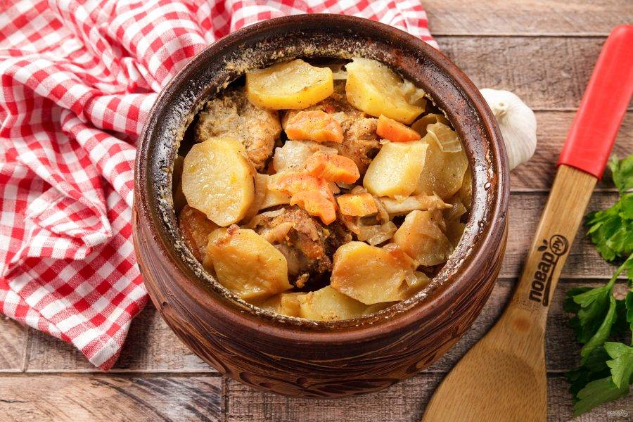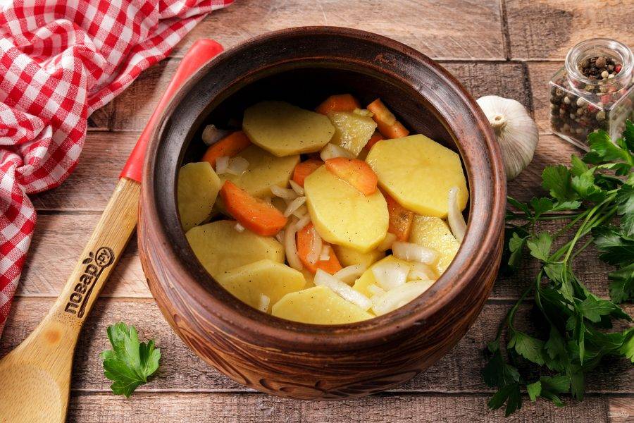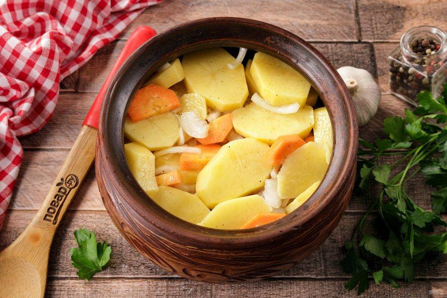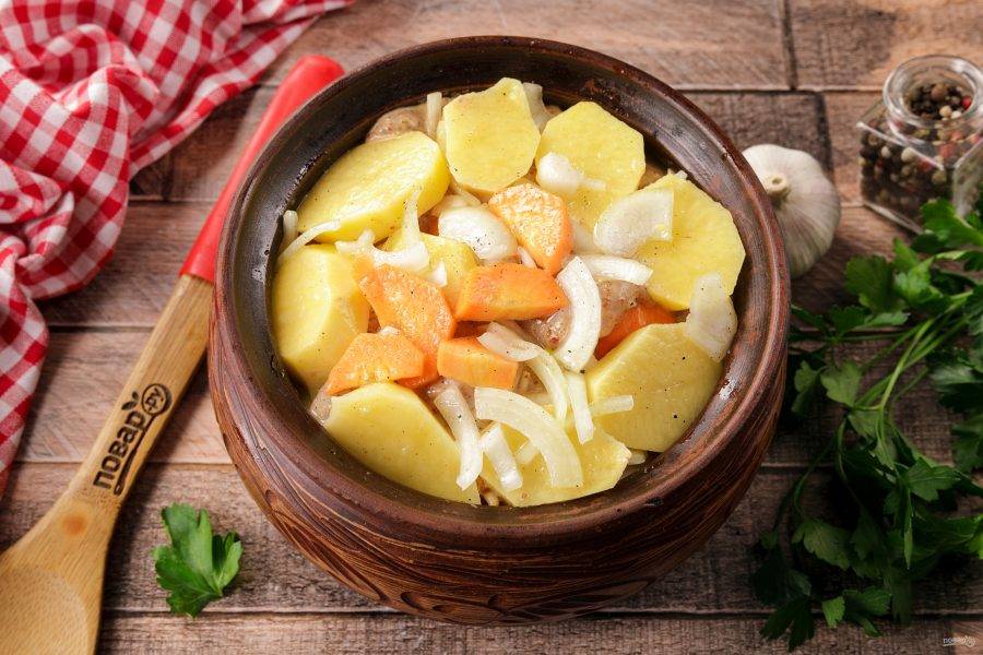 На мясо выложите остатки картофеля, лука и моркови. Горшочки можно смело наполнять доверху, самое главное — чтобы плотно закрылась крышка.