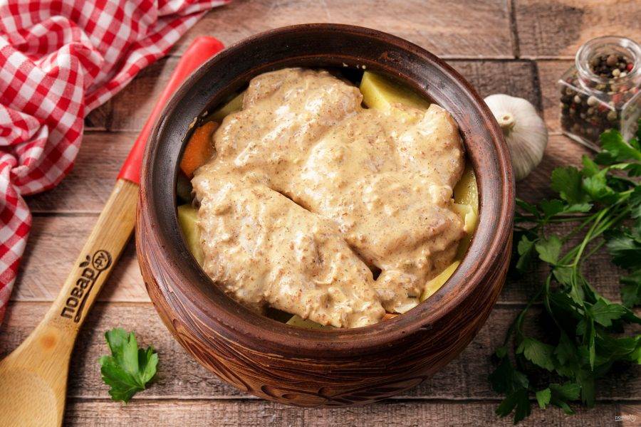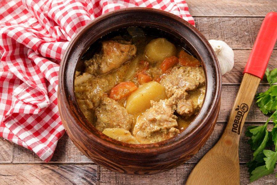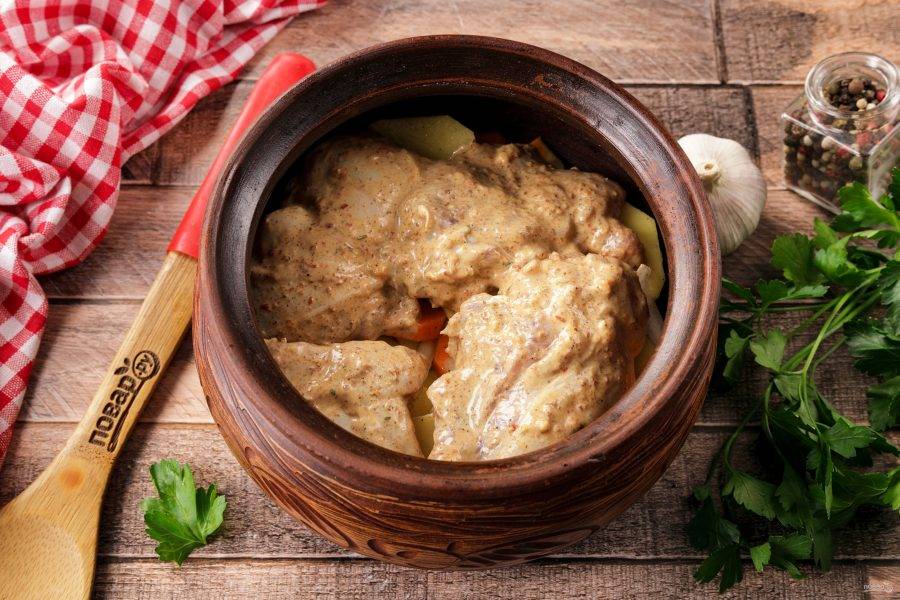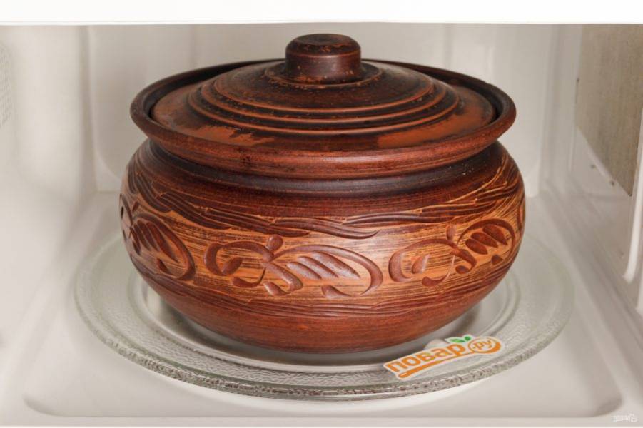 Поставьте горшочек в микроволновую печь и готовьте при максимальной мощности 1,5-2 часа. Ориентируйтесь на готовность мяса.
