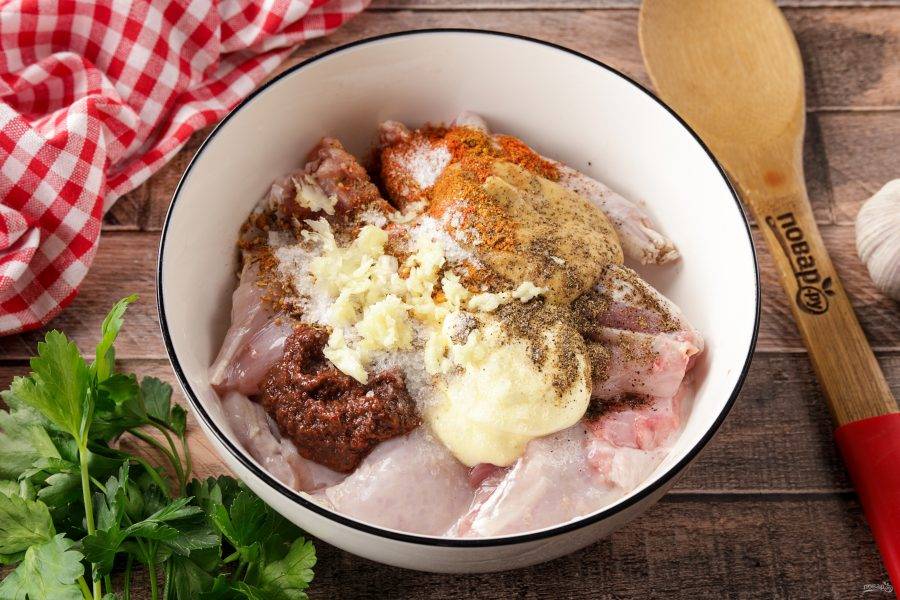 Добавьте горчицу, майонез, аджику, давленый чеснок, соль и специи по вкусу.
