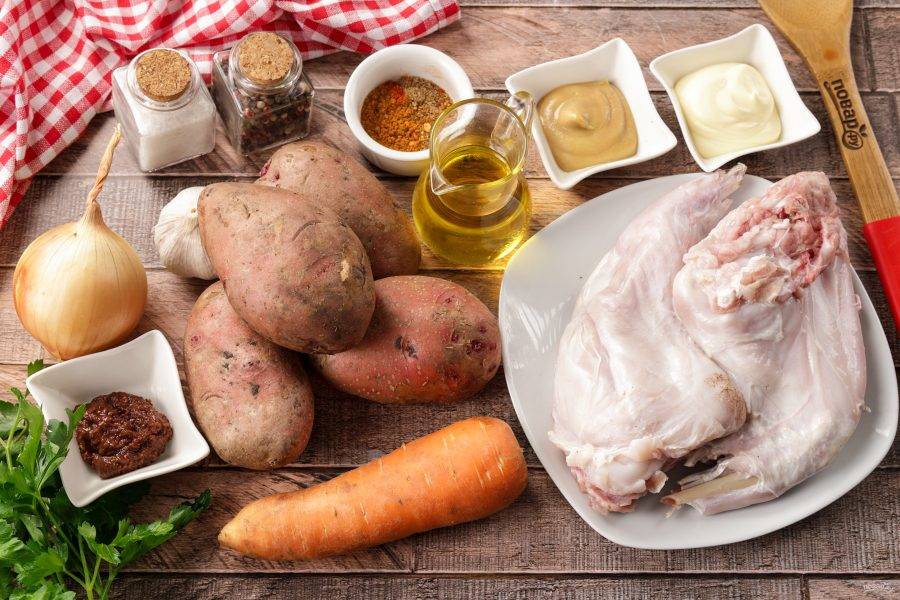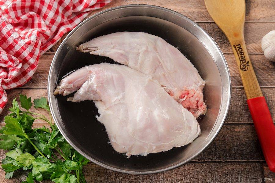Кролика промойте и замочите в холодной воде на 1-2 часа. Обычную воду можно заменить на минеральную с газом, молоко или сыворотку. Вымачивание поможет мясу стать более мягким и нежным, а так же избавиться от неприятного запаха, который бывает у диких зайцев. Если у вас молодой кролик и свежая тушка, то мясо можно приготовить не вымачивая.
