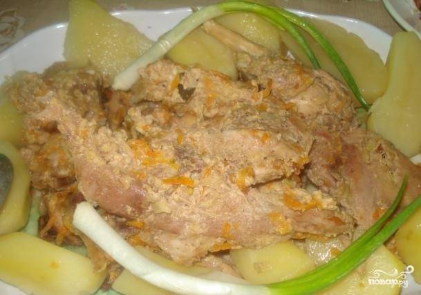 4. Пока запекался кролик, я приготовила на гарнир картофель. Хорошо к нему подходит зеленый лук и свежие овощи. Соления также хорошо сочетаются с кроликом. Если вы готовите его на праздничный стол, можно сделать его целиком. В таком случае натрите мясо чесноком и смажьте майонезом.
