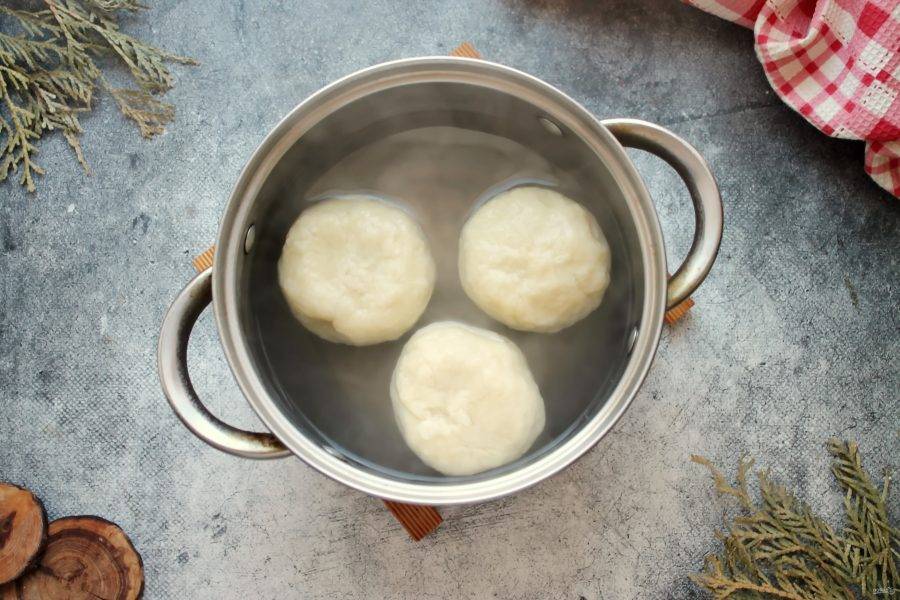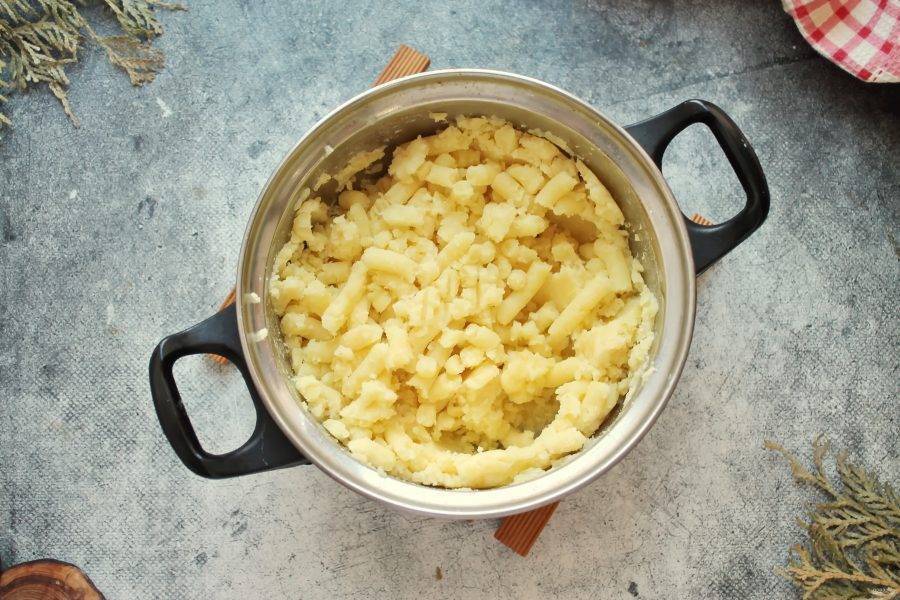 Картофель разрежьте на несколько частей и выложите в кастрюлю. Залейте картофель водой, посолите и оставьте на средний огонь. Доведите все до кипения и варите до готовности картофеля, примерно 15-20 минут. Полностью слейте с кастрюли воду, можно подсушить, немного подержав кастрюлю с картофелем на медленном огне. Картофель разомните в однородное пюре и полностью остудите.