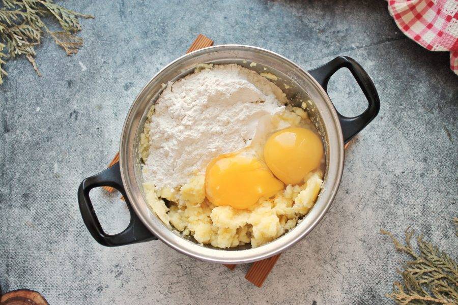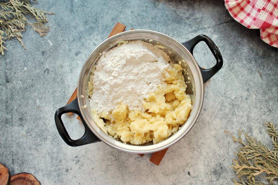 В остывшее картофельное пюре всыпьте пшеничную муку.