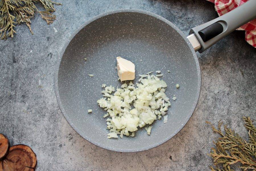 Репчатый лук мелко порежьте. В сковороду выложите сливочное масло, добавьте лук и обжаривайте его на медленном огне в течение 5-7 минут, до мягкости.