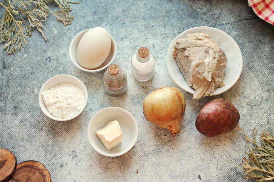 Подготовьте все необходимые ингредиенты для приготовления кропкакора. Картофель и репчатый лук почистите и вымойте.