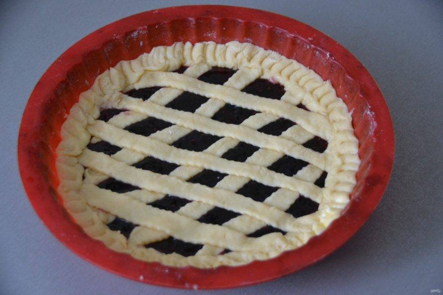 Оставшееся тесто раскатайте в пласт, фигурным ножом нарежьте полоски, выложите "решетку" поверх джема. Выпекайте кростату при температуре 180 градусов 25-30 минут.