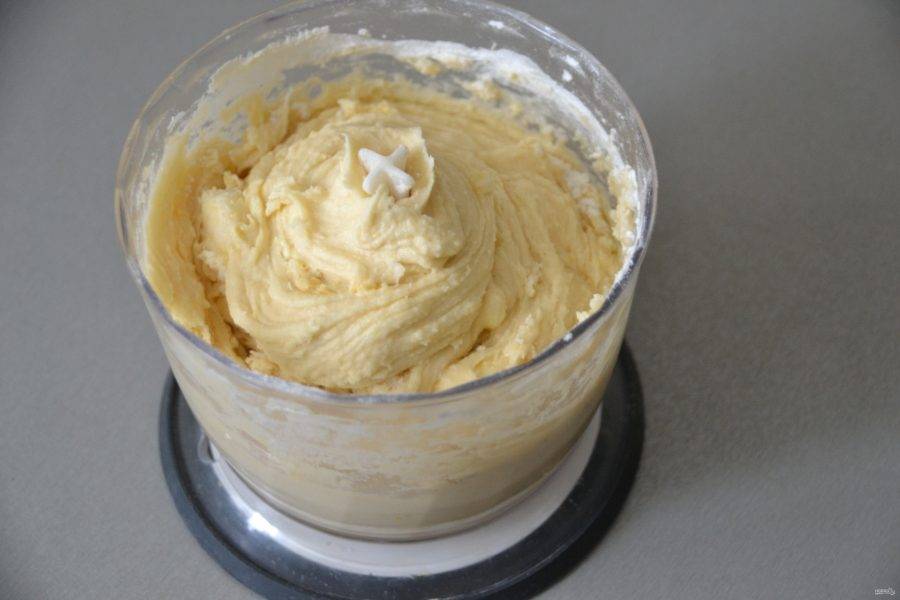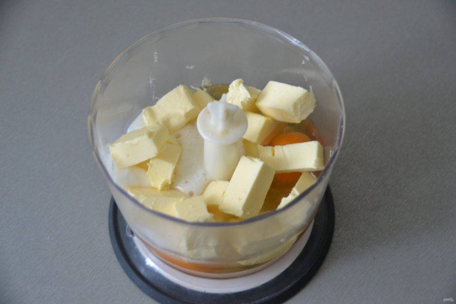 Тесто можно готовить традиционным способом на столе, порубив масло ножом, а можно приготовить в чаше блендера или миксера. Для этого влейте воду, вбейте яйца, добавьте соль, сахар.