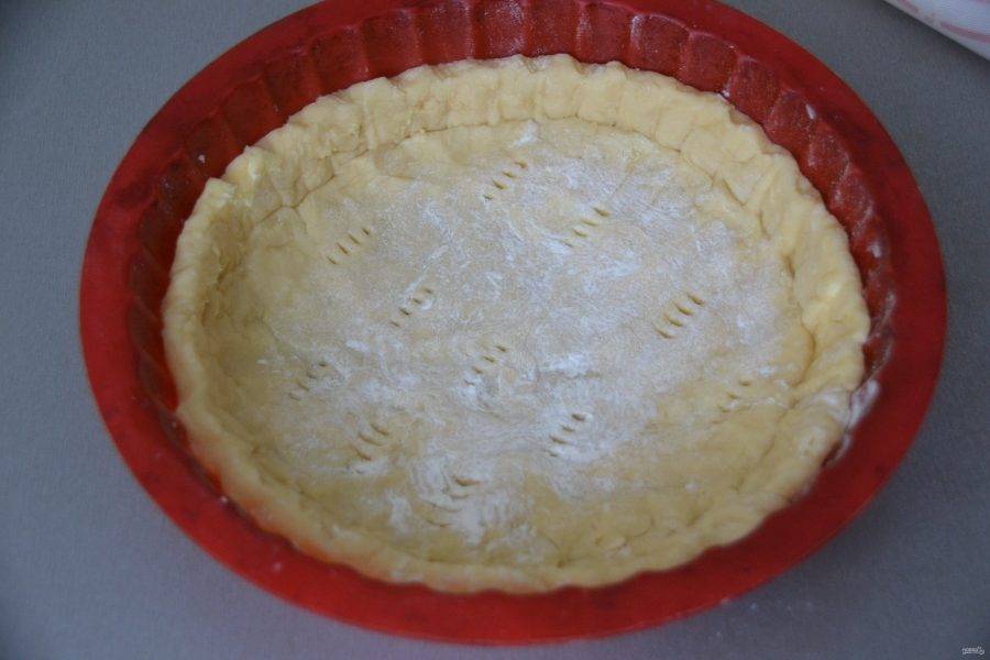 Большую часть теста выложите в форму для выпечки, сформируйте невысокие бортики, наколите дно вилкой.