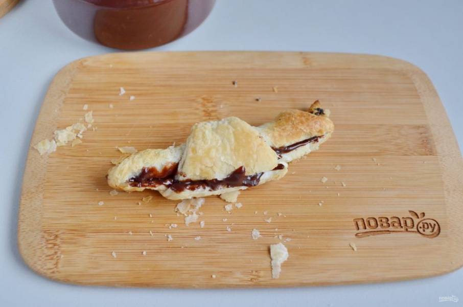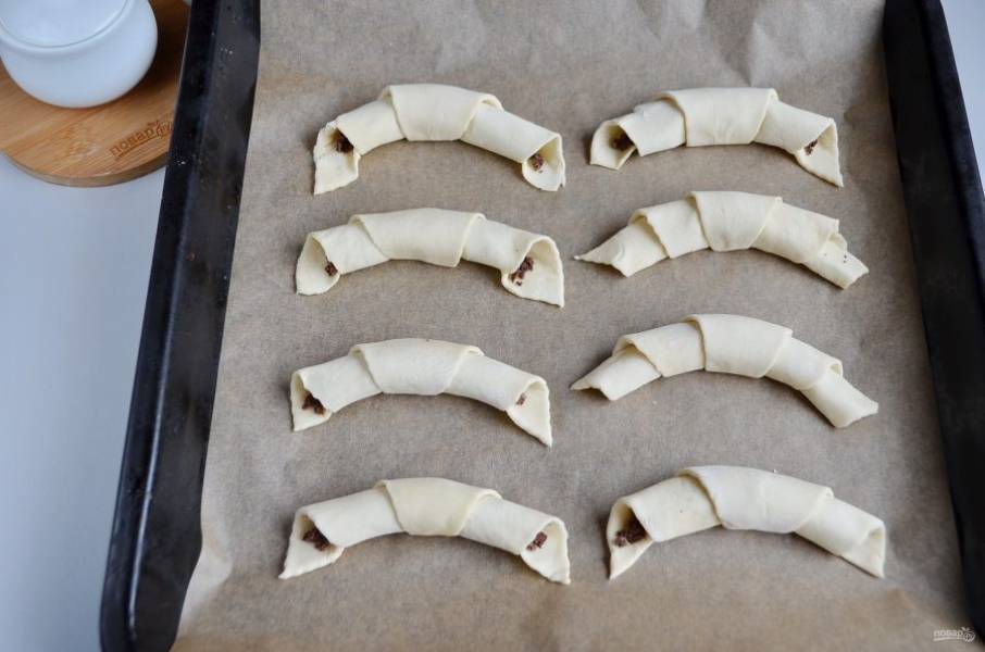 Придайте круассанам форму (сверните немного их в форму "месяца"), положите на пергамент и отправьте в горячую духовку на 12-15 минут. Температура - 220 градусов.