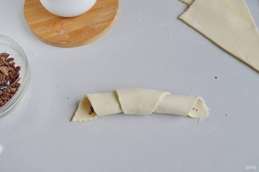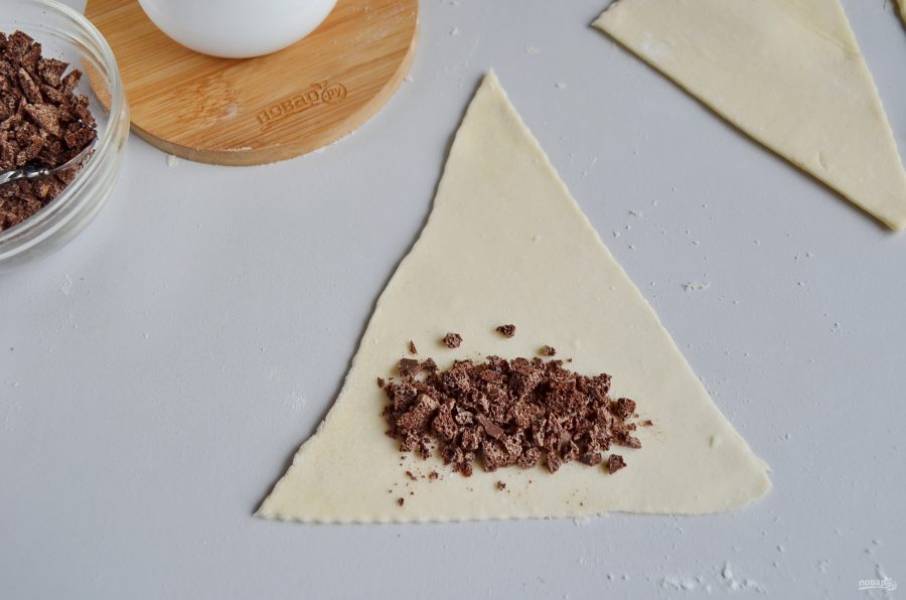 Положите пару чайных ложек шоколадной крошки на край теста.