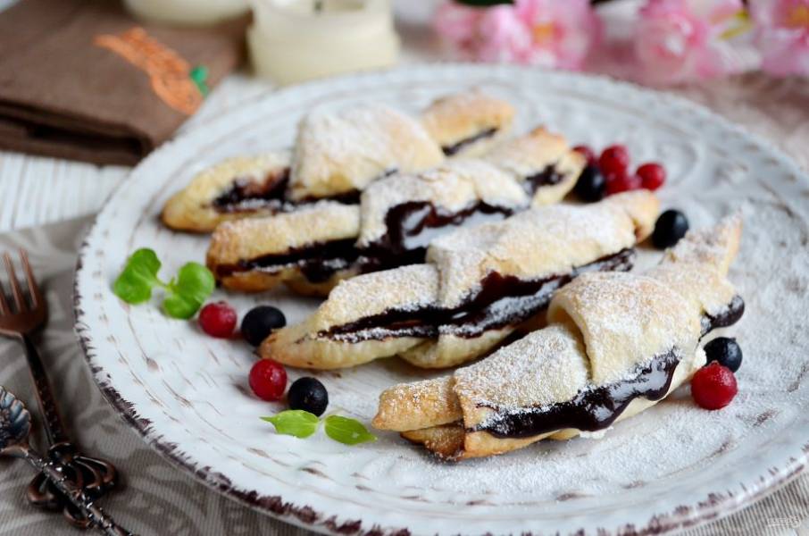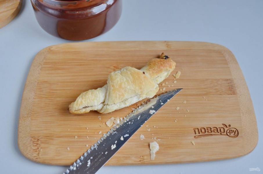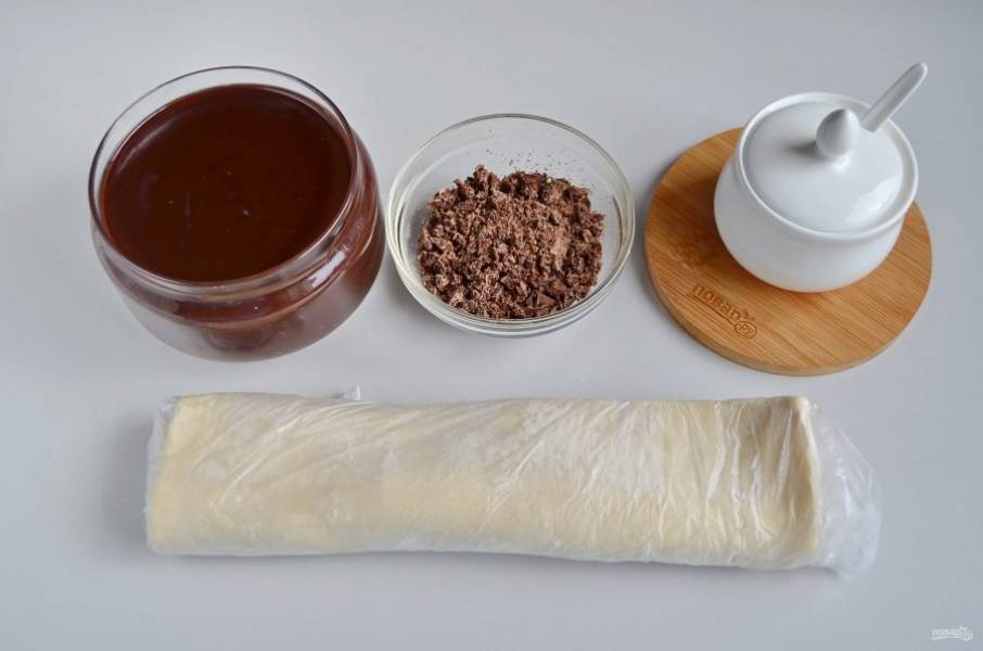 Подготовьте все необходимое. Тесто разморозьте при комнатной температуре. В оригинальном рецепте использовались шоколадные капли, но автор предложила заменить их шоколадной крошкой, если таковых нет под рукой.