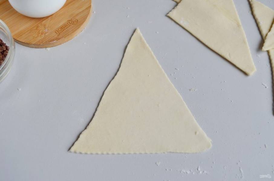 Тесто разложите на столе, я немного притрусила его мукой, порежьте на треугольники, у меня вышло 8 штук. Тонко раскатывать тесто не нужно, лучше когда круассаны пышные.