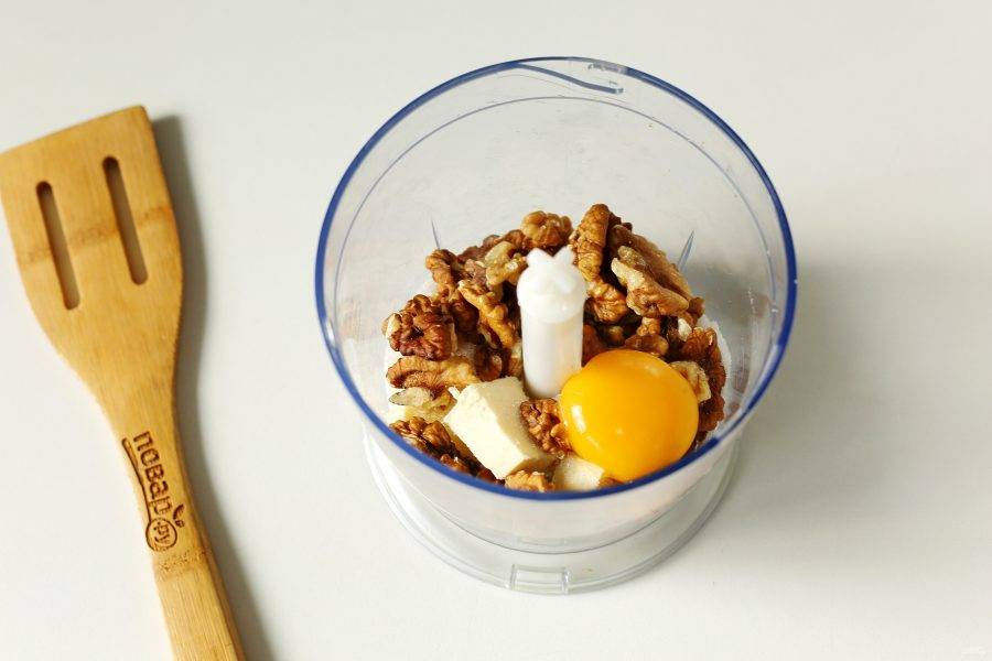 Выложите в чашу блендера размягченное сливочное масло, орехи, сахар и один желток.