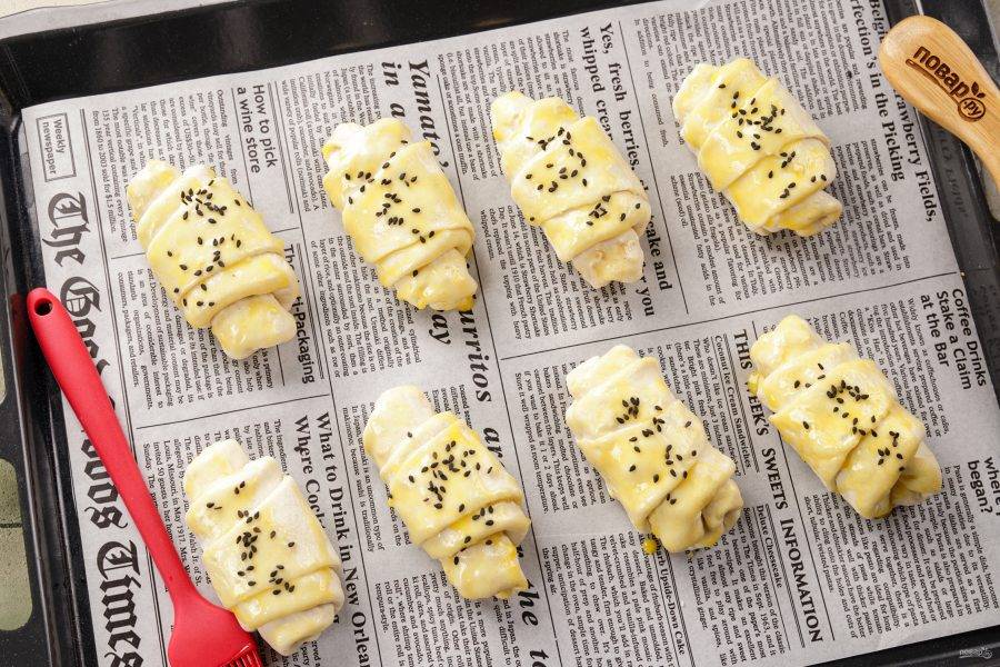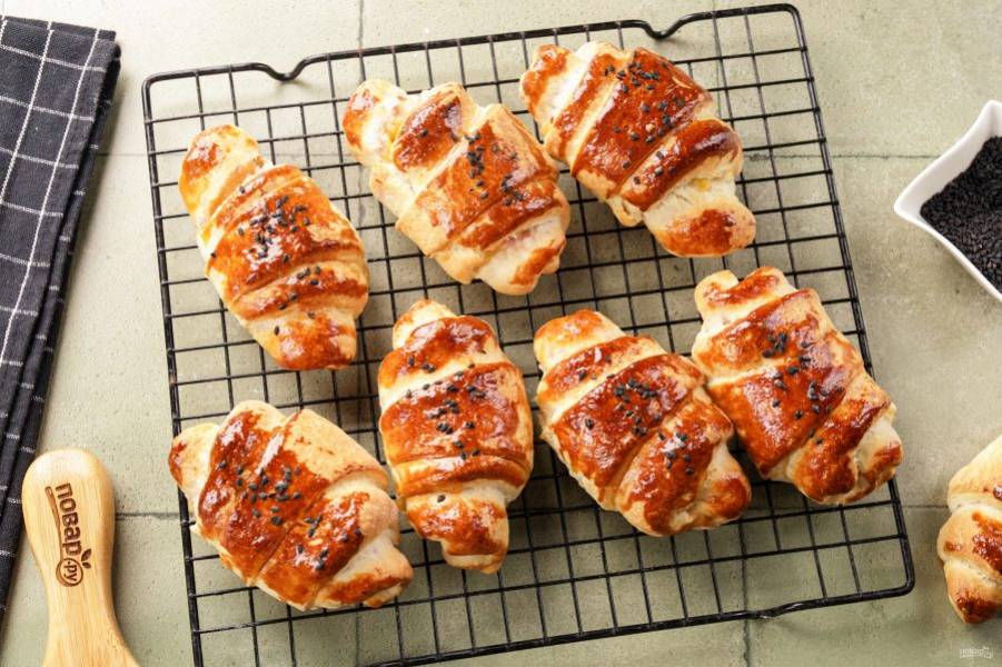 Выложите круассаны на противень, смазанный маслом или застеленный пергаментной бумагой, силиконовым ковриком. Смажьте желтком и посыпьте кунжутом.