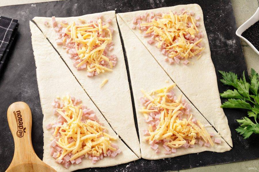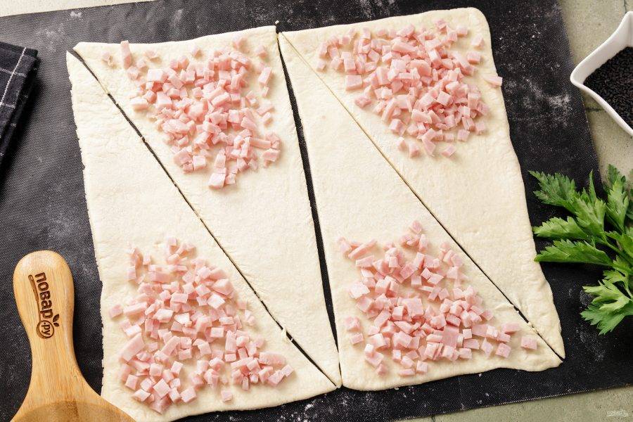 Выложите на каждый треугольник (широкую часть) немного ветчины.