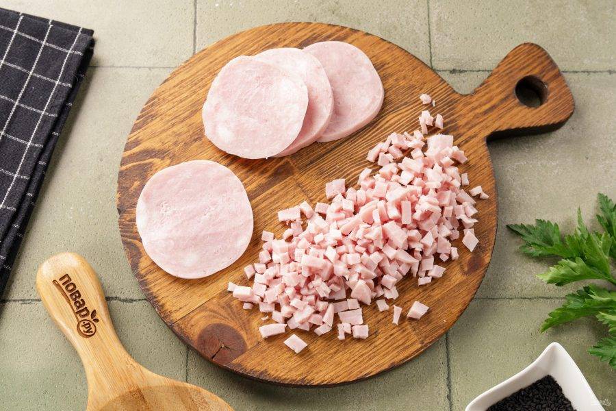 Ветчину натрите на тёрке или нарежьте мелкими кубиками.