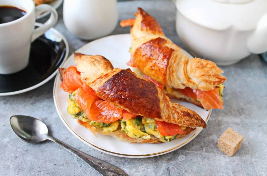 Семгу порежьте тонкими полосками и разложите на омлете. Закройте все второй частью круассана и подавайте к столу.