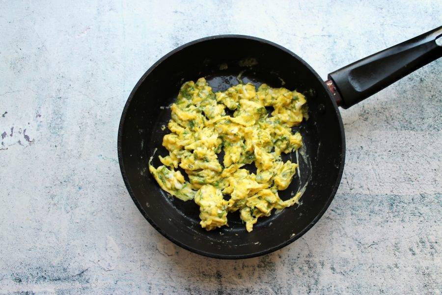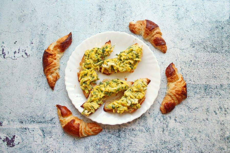 Круассаны разрежьте вдоль на две части и выложите на нижнюю часть омлет.