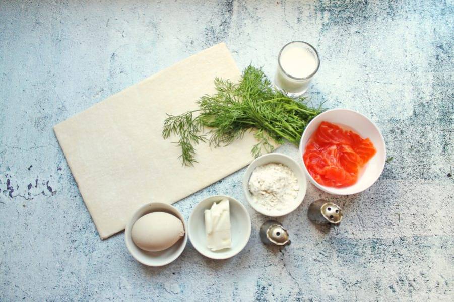 Подготовьте все необходимые ингредиенты для приготовления круассанов со взбитыми яйцами и семгой. Тесто достаньте заранее, чтобы оттаяло.