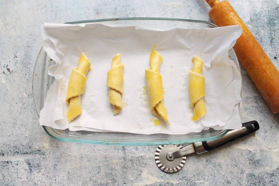 Каждый треугольник сверните в рулет, начиная с широкой стороны. Выложите круассаны на расстоянии на противень с пергаментом, смажьте яйцом.