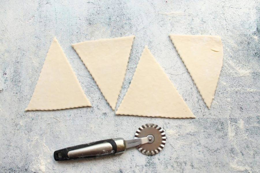 Рабочую поверхность посыпьте мукой и немного раскатайте тесто в ширину. Разрежьте тесто на четыре треугольника.
