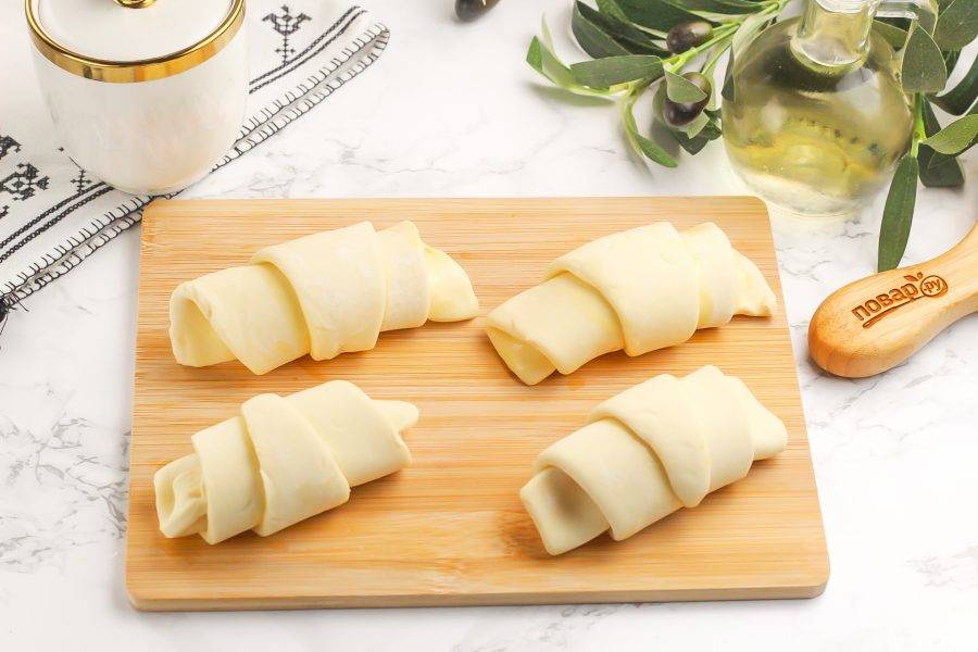 Начиная от широкого края с начинкой, заверните треугольники рулетиком, слегка сплющивая края и стараясь поместить узкий конец теста в середину. Обязательно кончик теста оставляйте под самим круассаном, чтобы он не развернулся при выпекании.