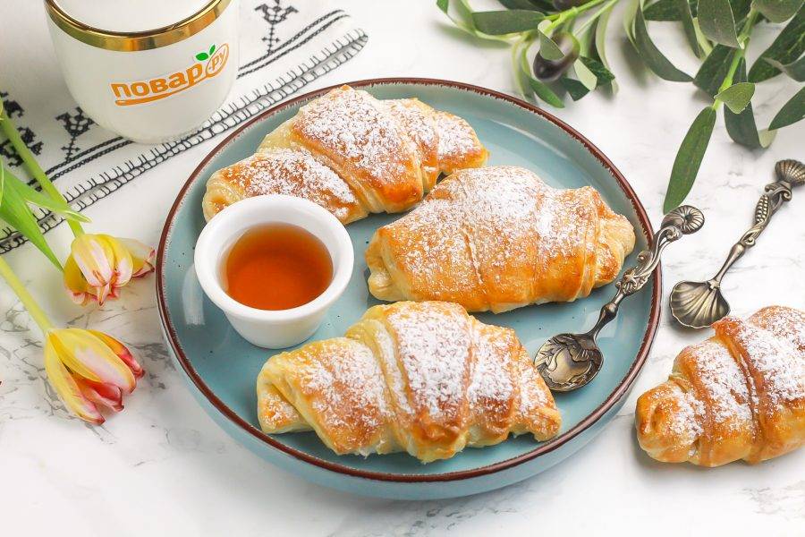 Извлеките круассаны на доску или тарелку и дайте слегка остыть, а после — присыпьте сахарной пудрой.