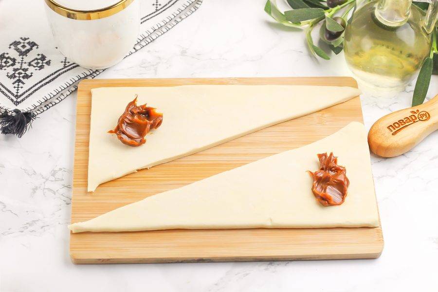 На широкий края треугольников выложите по 1/2 ст.л. вареной сгущенки или любой другой сладкой начинки. Много не выкладывайте, потому что в процессе выпекания тесто сдавит начинку и она может вытечь за края изделия.