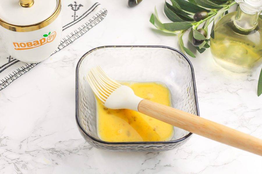 Взбейте куриное яйцо в пиале или креманке вилкой или венчиком 1-2 минуты. Можно использовать только желток с 1 ст.л. молока любой жирности.
