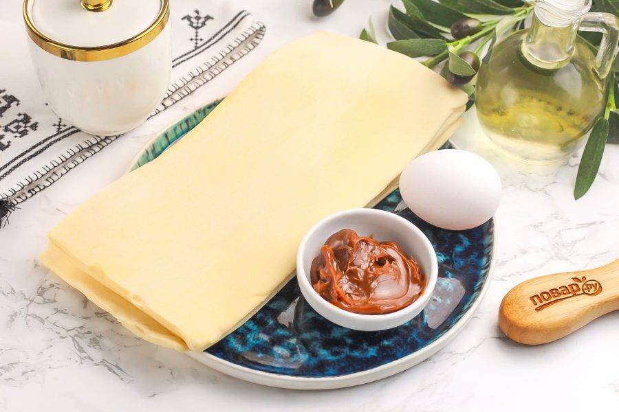 Подготовьте указанные продукты. Тесто разморозьте заранее за полчаса до начала приготовления.