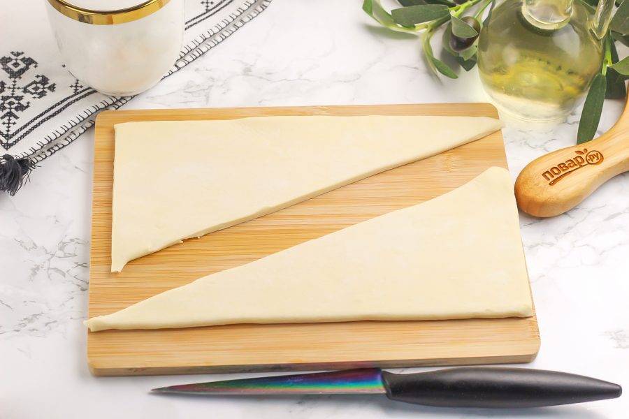 Каждый пласт теста разрежьте пополам по диагонали, получая треугольники с длинными кончиком.