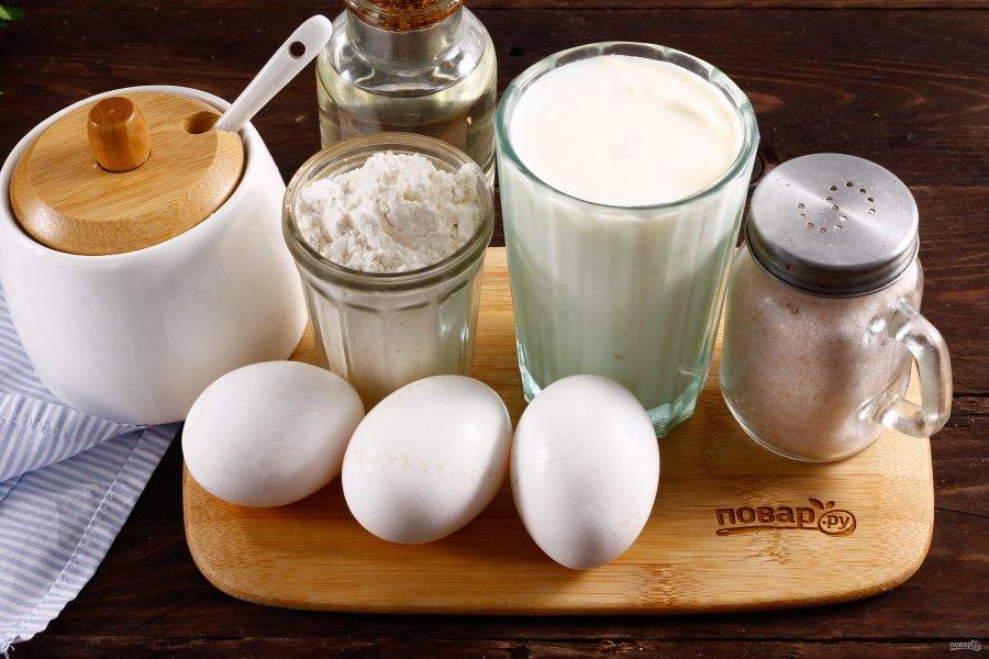 Вбейте куриные яйца в емкость, влейте кефир любой жирности и всыпьте сахар, соль. Взбейте все венчиком.