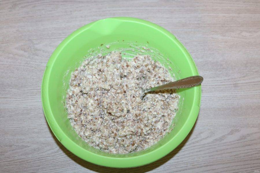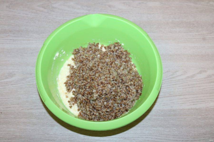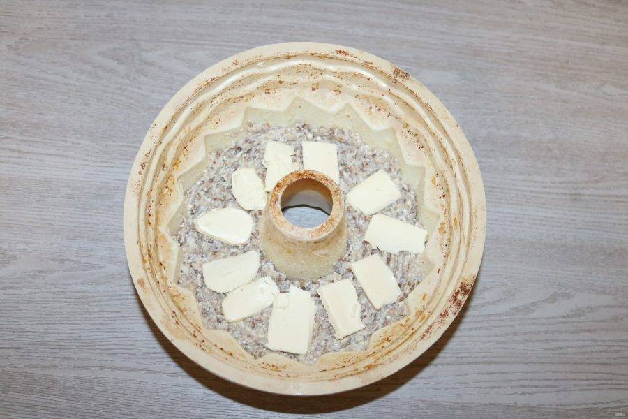 Форму для запекания смажьте маслом и посыпьте панировочными сухарями. Выложите гречнево-творожную массу. Сверху нарежьте и выложите тоненькие кусочки сливочного масла. Отправьте в разогретую духовку до 190 градусов на 40 минут.