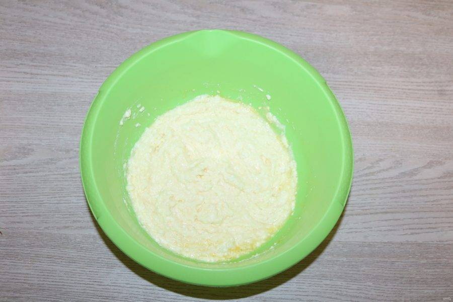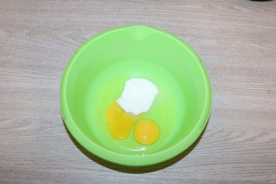 В миску вбейте яйца, добавьте сахар, размешайте.