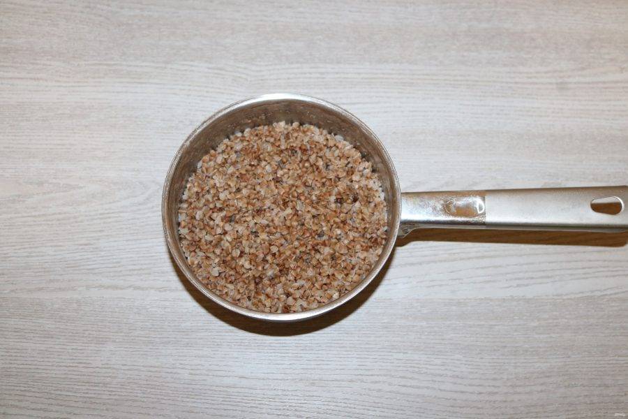 Гречку промойте, залейте двумя стаканами воды, отварите, посолив по вкусу, до готовности. Остудите.