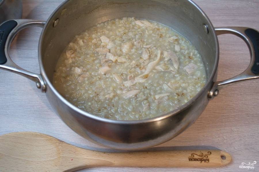 Добавьте распаренную перловку вместе с водой. Долейте еще 1 стакан воды, и поставьте вариться перловку на средний огонь. Мясо снимите с костей, нарежьте и добавьте к перловке. Варите все вместе до готовности перловки.