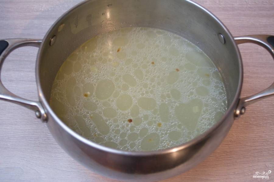 В другую кастрюлю насыпьте перловку. Залейте 2 стаканами крутого кипятка и оставьте набухать. Кастрюлю с крупой укутайте, чтобы крупа хорошо пропарилась.