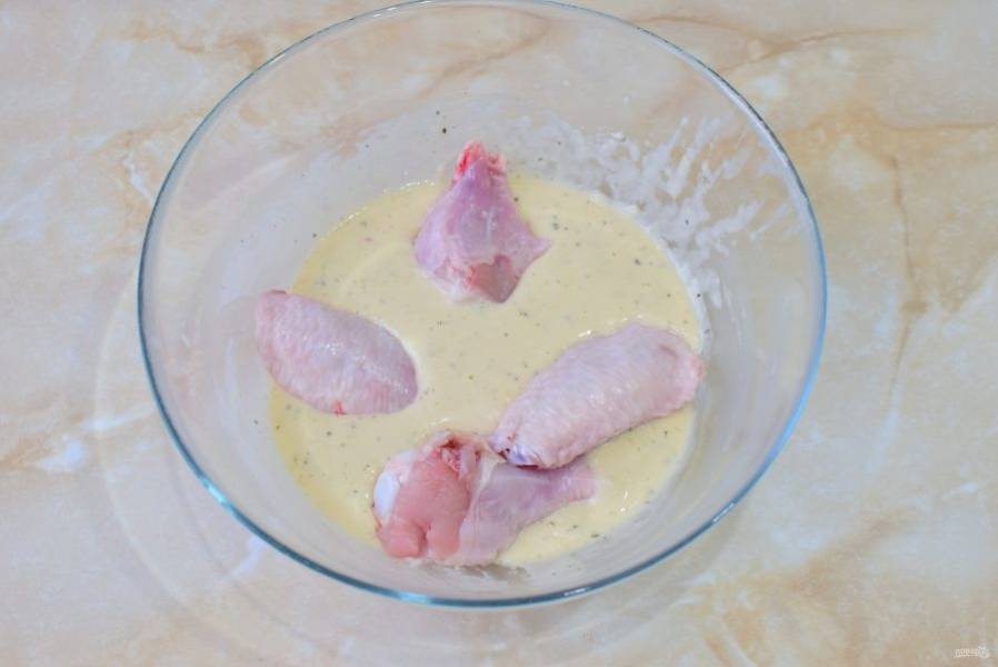 По вкусу подсыпьте соль и специи. Все смешайте до однородного состояния, чтобы не оставалось комочков муки. Консистенцию кляра отрегулируйте на свой вкус. Чем гуще будет кляр, тем плотнее будет оболочка вокруг крылышек.