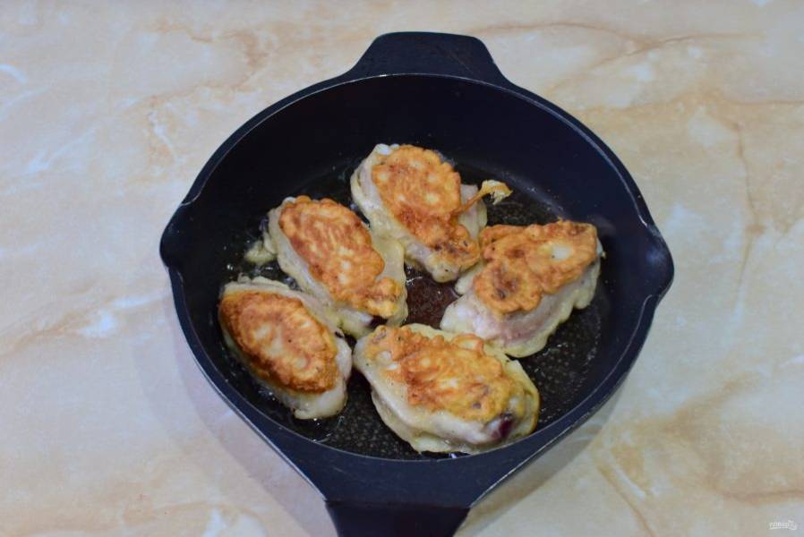 В горячую сковороду влейте масло и выложите крылышки в кляре. Готовьте их на небольшом огне по 3-4 минуты с каждой стороны.